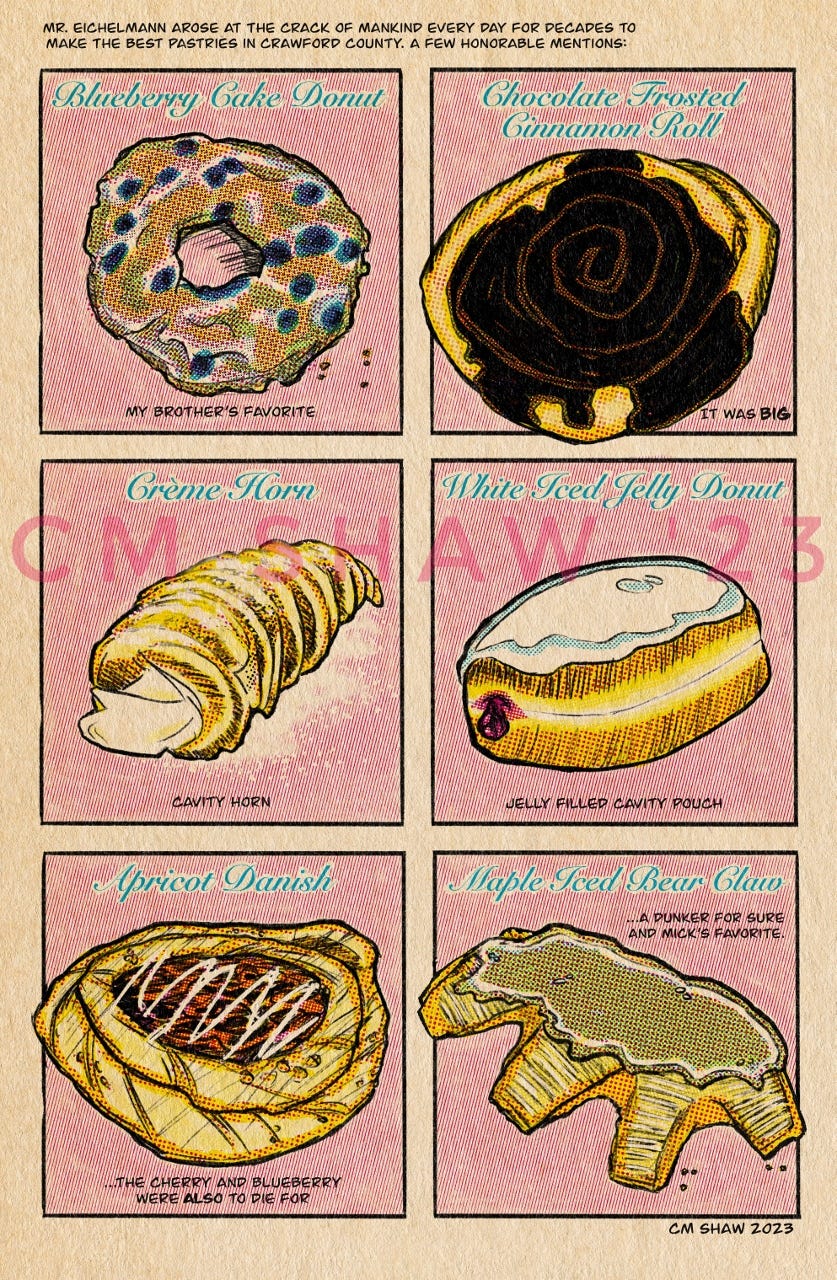 Continued from my last post, the Eichelmann’s Bakery Honorable Mentions page I sketched out last night got inked and colored the next day. This will add some atmosphere/sense of place to my Night Watchman story. I am seriously considering making a poster version of this without the story-related commentary/verbiage as an extra item to sell when I’m showing.
